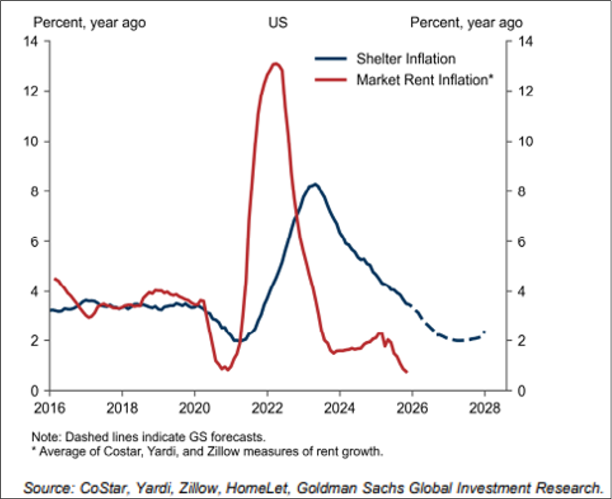 Inflation is forecasted to continue its downward path in 2026, easing from elevated levels in 2025 toward the Federal Reserve's 2% target, though it may remain sticky due to wage pressures and tariff effects. The largest component of the US CPI Index: shelter, which comprises about 40% of the index and includes owners’ equivalent rent, is expected to decline in 2026 (see chart below).